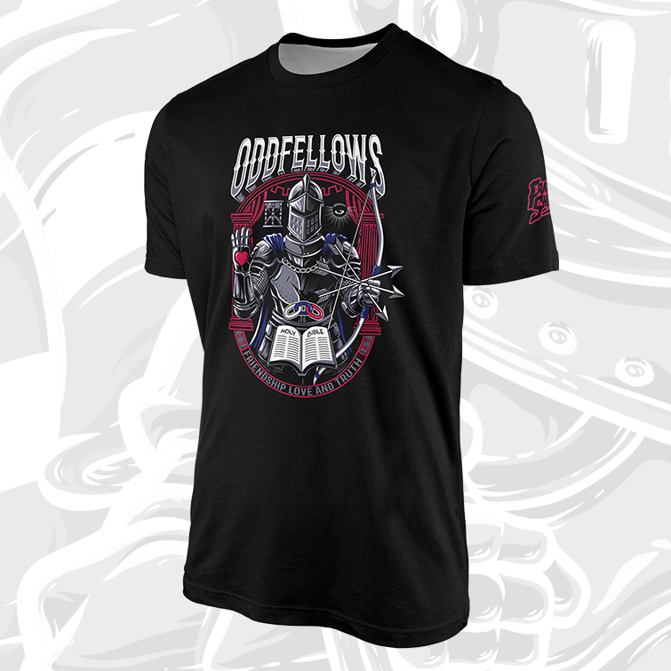 A bold Odd Fellows design that blends tradition with edge. Centered on a steel-clad guardian, the artwork features the bow and three arrows—Friendship, Love, and Truth—held with purpose, not decoration. The open book grounds the piece in moral duty, while the chained heart and vigilant eye signal loyalty, vigilance, and accountability. Framed in deep red geometry, the design balances old-world symbolism with modern grit. This shirt isn’t about nostalgia or costume—it’s a statement of values carried forward, worn with intent, and understood by those who know what the symbols demand.